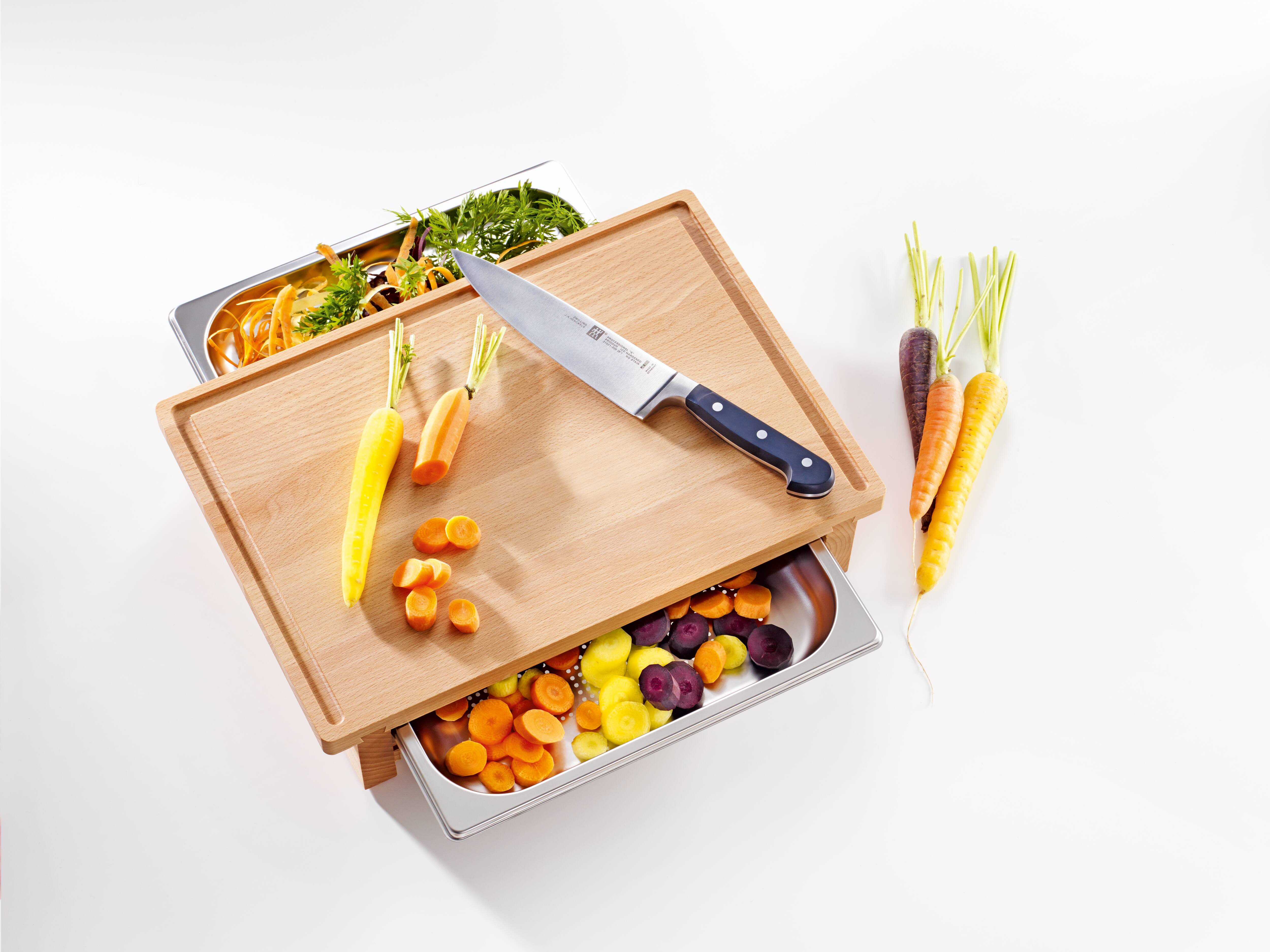 Разделочная доска с двумя вставленными контейнерами для пароварки.