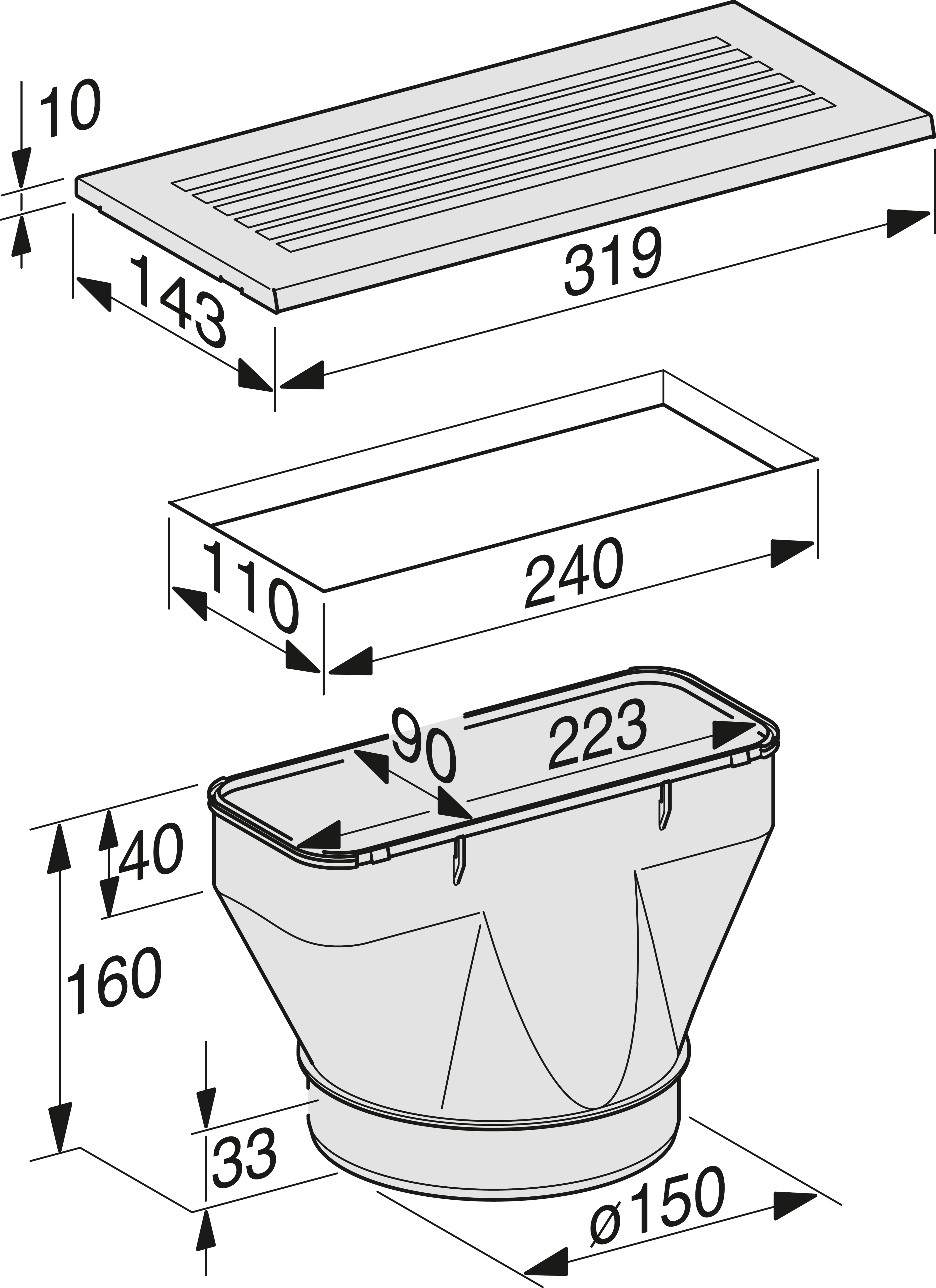В комплект поставки входят: выпускная решетка из нержавеющей стали, хомут для шланга.