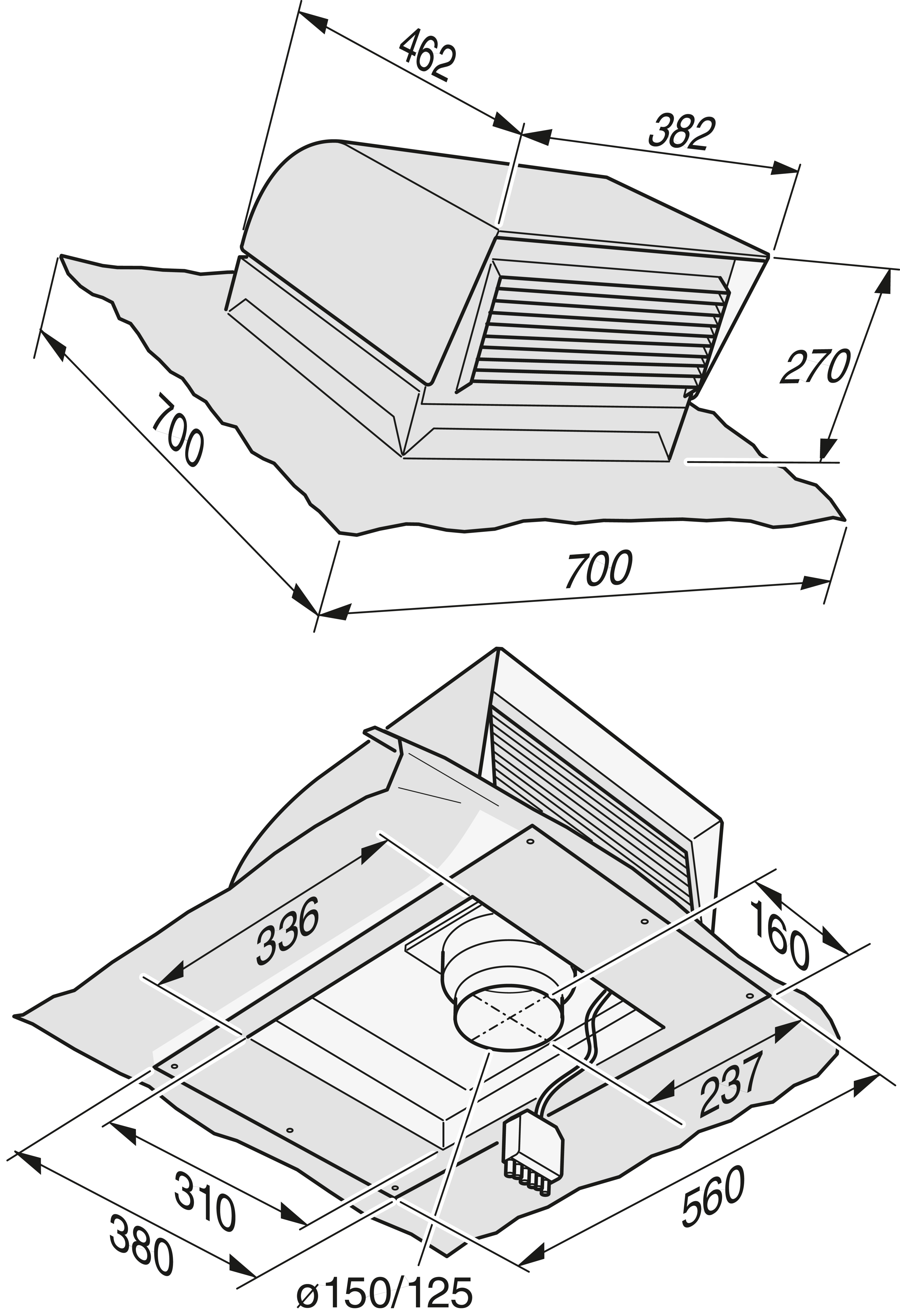 Подключение вытяжного воздуха диаметром 125/150 мм.