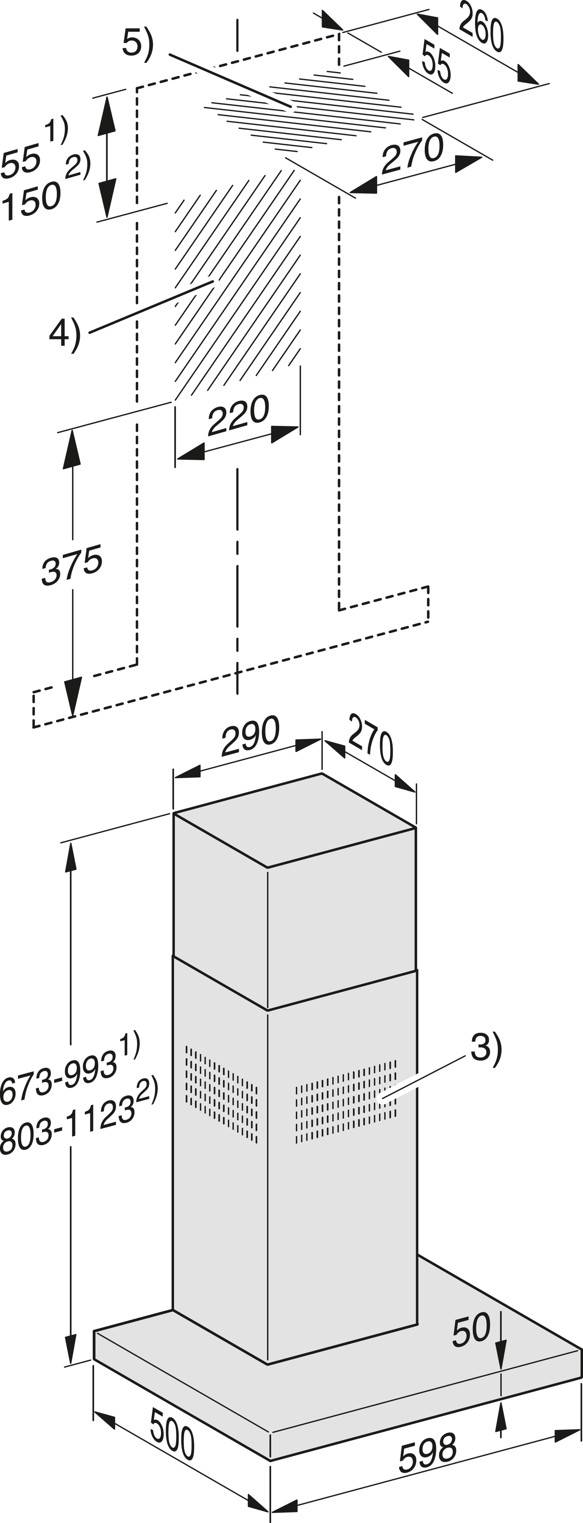 Общая высота вытяжки для режимов отвода воздуха и отвода с выносным вентилятором минимально (мм)