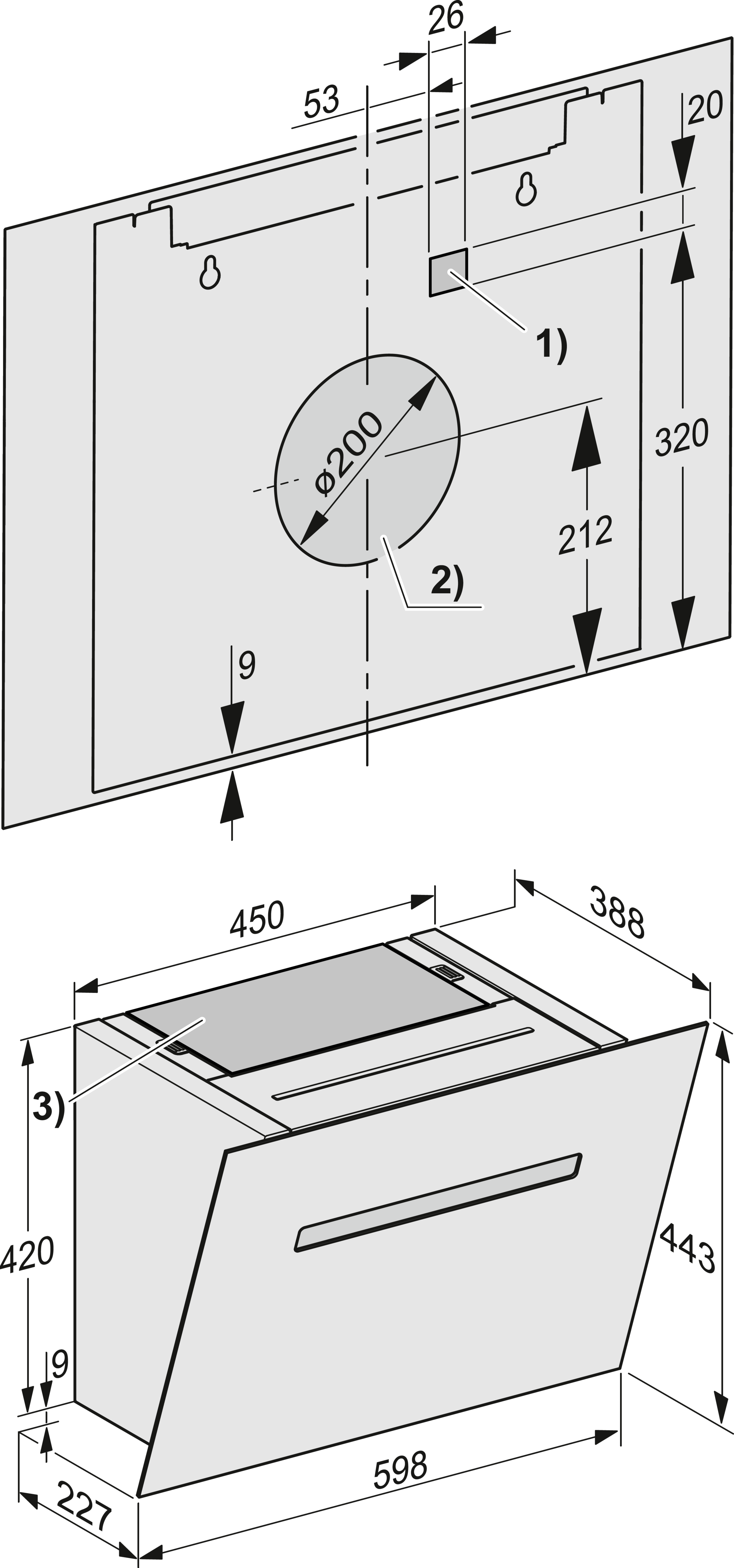 Общая высота кухонной вытяжки в режиме рециркуляции минимально, в мм